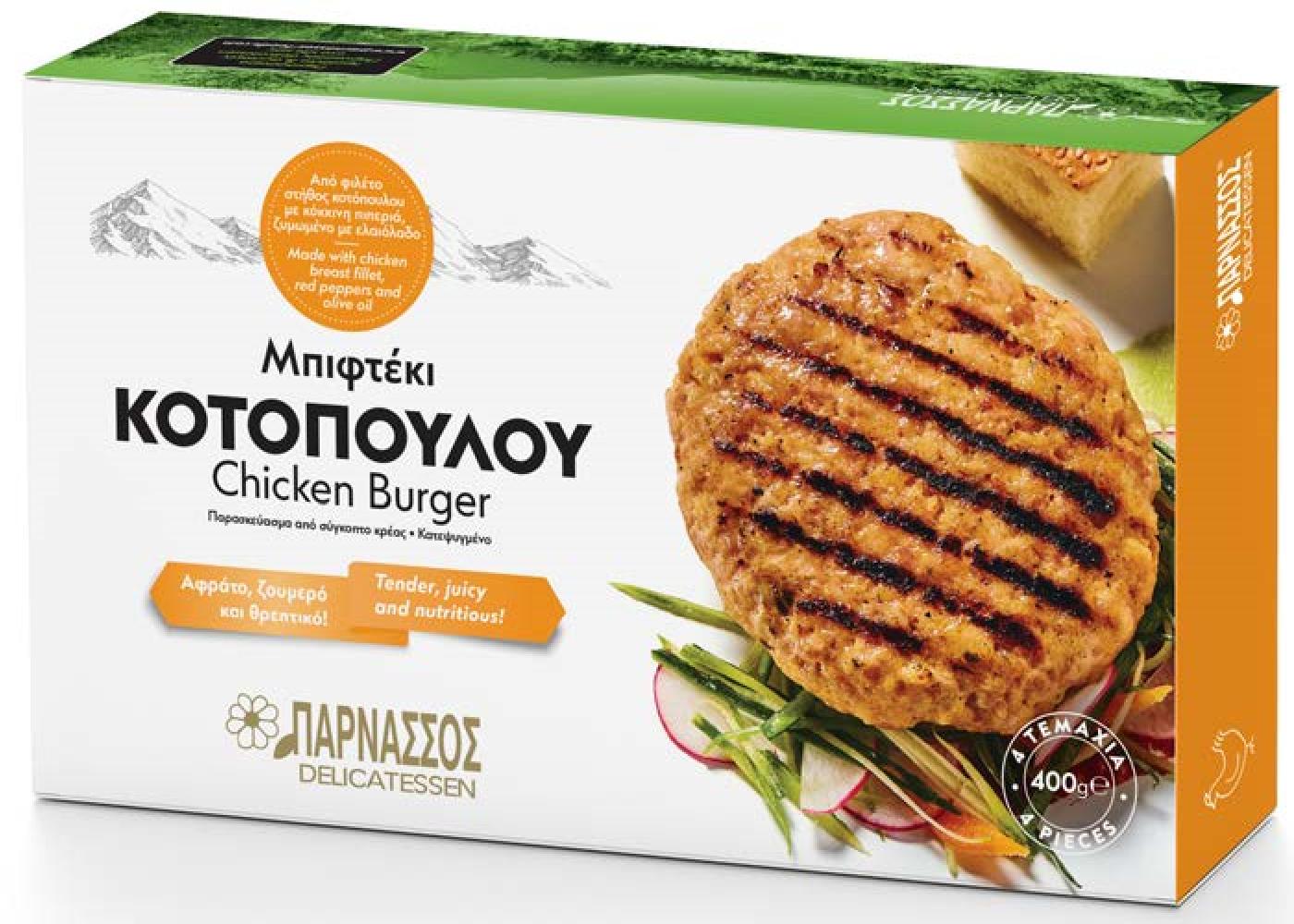 Νέο προϊόν, υγιεινό με 90% φιλέτο στήθους κοτόπουλου, ζυμωμένο με αγνό παρθένο ελαιόλαδο, κόκκινη πιπεριά και μεσογειακά μυρωδικά ( φρέσκος δυόσμος- φρέσκος μαϊντανός ). Για πιάτο, σε burger ταιριάζει πολύ με πάστα ελιάς, φέτα και φρέσκια ντομάτα. Προϊόν επανάσταση για την οικογένεια σας, τα παιδιά, τους αθλητές, για όσους θέλουν να προσέχουν την διατροφή τους, αλλά και για αυτούς που απλά θέλουν να απολαύσουν ένα νόστιμο και υγιεινό γεύμα.